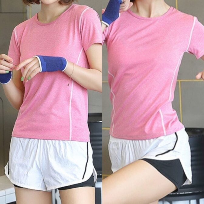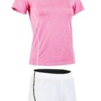 ランニングファション 半袖トップス+ショートパンツ レディース ピンク×ホワイト 上下2点セット